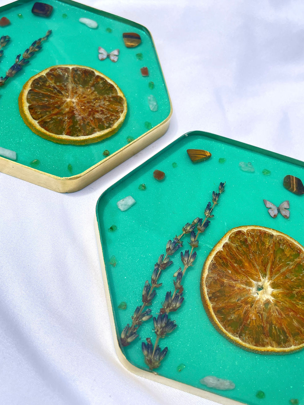 hexagon resin coasters filled with real resin topped with genuine crystals aligned in a pattern around a dried orange, dried lavender and a paper mimicked butterfly with gold foil painted edges