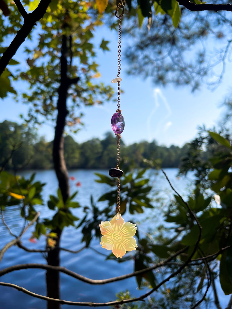 a bone carved, seashell-flower hanging by gold chain with genuine crystal chips beads and a pink sun-catcher