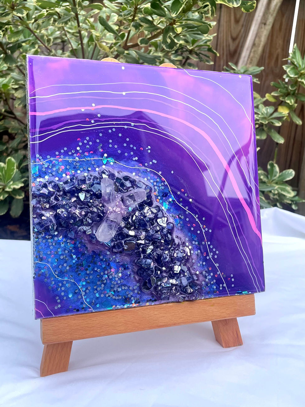 glitter and purple, pink and dark blue resin surrounding broken glass and genuine clear Arkansas quartz detailed with fine lines in purple, pink and white with silver foil embossed edging